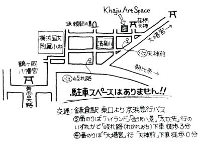 鎌倉は鶴が岡八幡宮にほど近い、緑に囲まれた静かな住宅街にあります。 築70年以上の古い日本家屋の和室を、はた織り部屋・貸しスペースに、ふとん部屋は防音ピアノ室に、台所は染め場に改造。 染織家、ピアニスト、建築家、そして貸しスペースを利用している様々な分野のクリエーターとその友人で、教室運営、イベント企画、活動発表、地域活動などを共同で行っています。 【所在地】 〒248-0002鎌倉市二階堂57-1 tel&fax 0467-23-3663 e-mail:art@khaju.com ![]() JR鎌倉駅東口より徒歩15分 又は 京浜急行バス4番のりば「大塔宮」行 "天神前"下車徒歩0分 5番のりば「ハイランド」「金沢八景」「太刀洗」行 "岐れ路"下車徒歩3分 |
